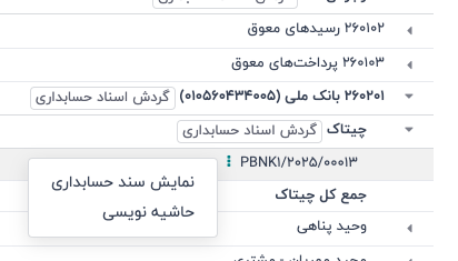 پس از پیمایش میان حساب های معین، حساب معین مورد نظر خود را انتخاب و به زیر مراتب ان یعنی اشخاص و یا دفاتر روزنامه بانک مراجعه نمایید. سپس مجدد برروی سطح مورد نظر کلیک نمایید تا اسناد مربوط به ان ذینفع/مخاطب نمایش داده شود. سپس با کلیک برروی سه نقطه مقابل نام سند ، می توانید برروی دکمه نمایش سند حسابداری کلیک نمایید: