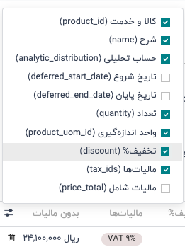 در تب «آیتمهای روزنامه»، میتوانید جزئیات تخفیف را ببینید. برای این کار روی دکمه «نمایش ستونها» کلیک کرده و ستونهای «تاریخ تخفیف» و «مبلغ تخفیف» را اضافه کنید.