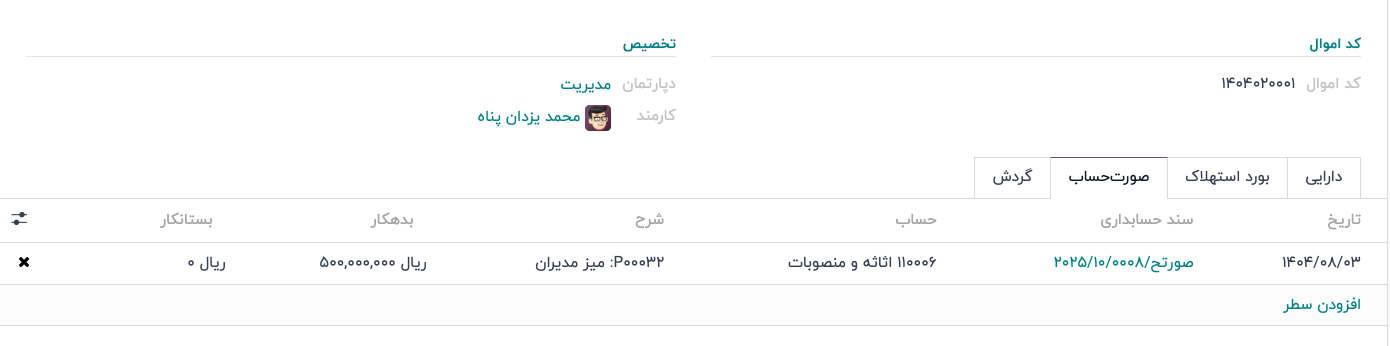 وقتی میخواهید یک دارایی جدید ثبت کنید، اول حساب دارایی ثابت را در فیلد مربوطه وارد کنید.