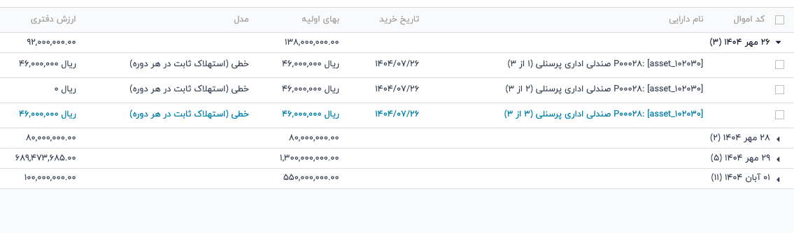 این جدول تمام سندهایی را نشان میدهد که سیستم برای استهلاک دارایی ثبت خواهد کرد و اینکه هر کدام در چه تاریخی قطعی میشوند.
