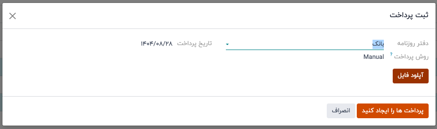 ۴. در پنجره ثبت پرداخت، دفتر روزنامه، روش پرداخت و تاریخ پرداخت را مشخص کنید.