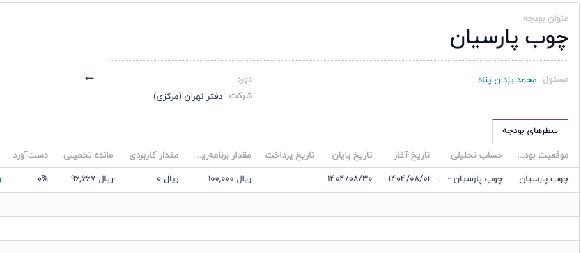 برای مشاهده وضعیت بودجه، به مسیر حسابداری ← بودجه بروید و بودجه مربوط به پروژه چوب پارسیان را باز کنید تا ببینید بر اساس هزینهها و درآمدهای ثبتشده در حساب تحلیلی مرتبط، چگونه تغییر میکند.