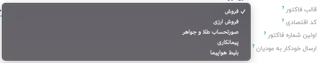- قالب فروش: نوع قالب فاکتور برای ارسال به مودیان